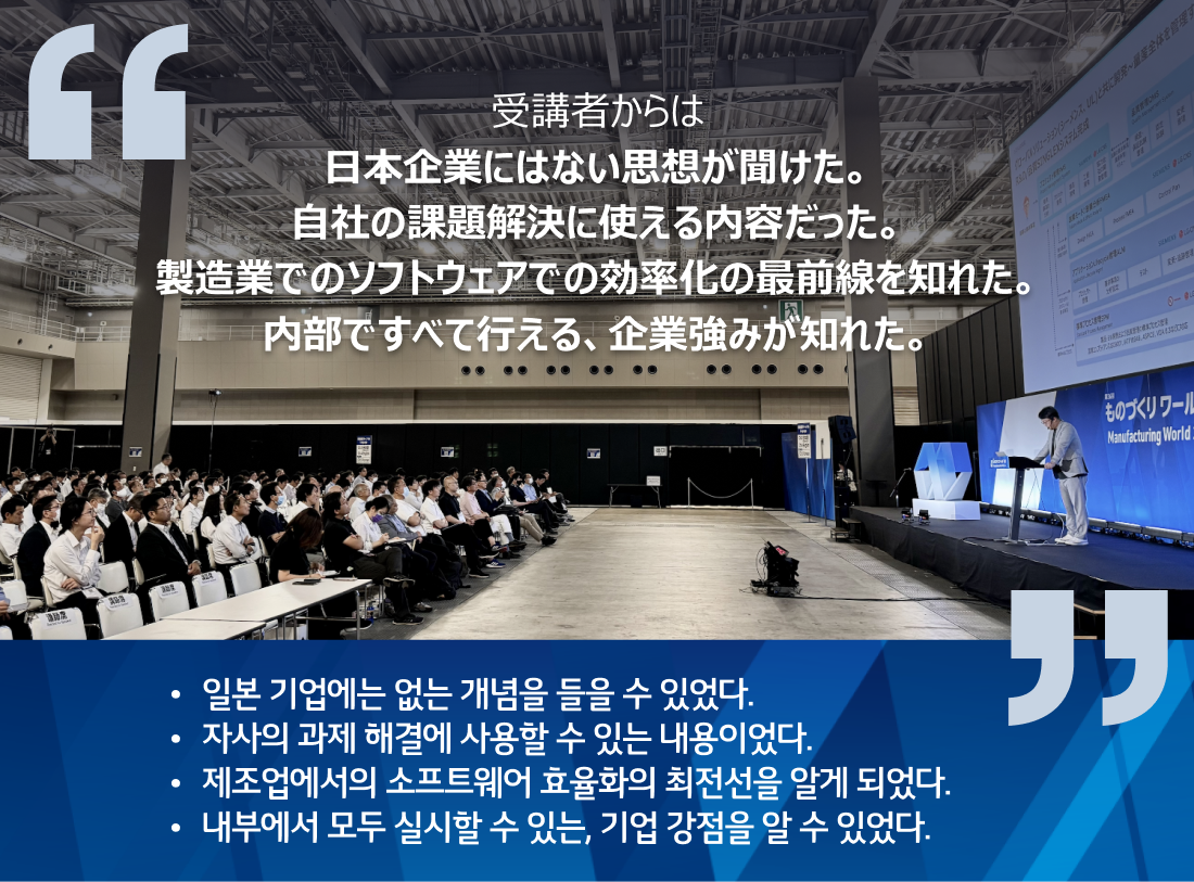 마지막으로 일본 최대 제조업 컨퍼런스에서 선보인 최강 제조기업을 위한 핵심 업무별 DX 요구사항과 기업형 SaaS의 모습이 궁금하시다면 전문가의 상담을 통해 직접 만날 수 있습니다.