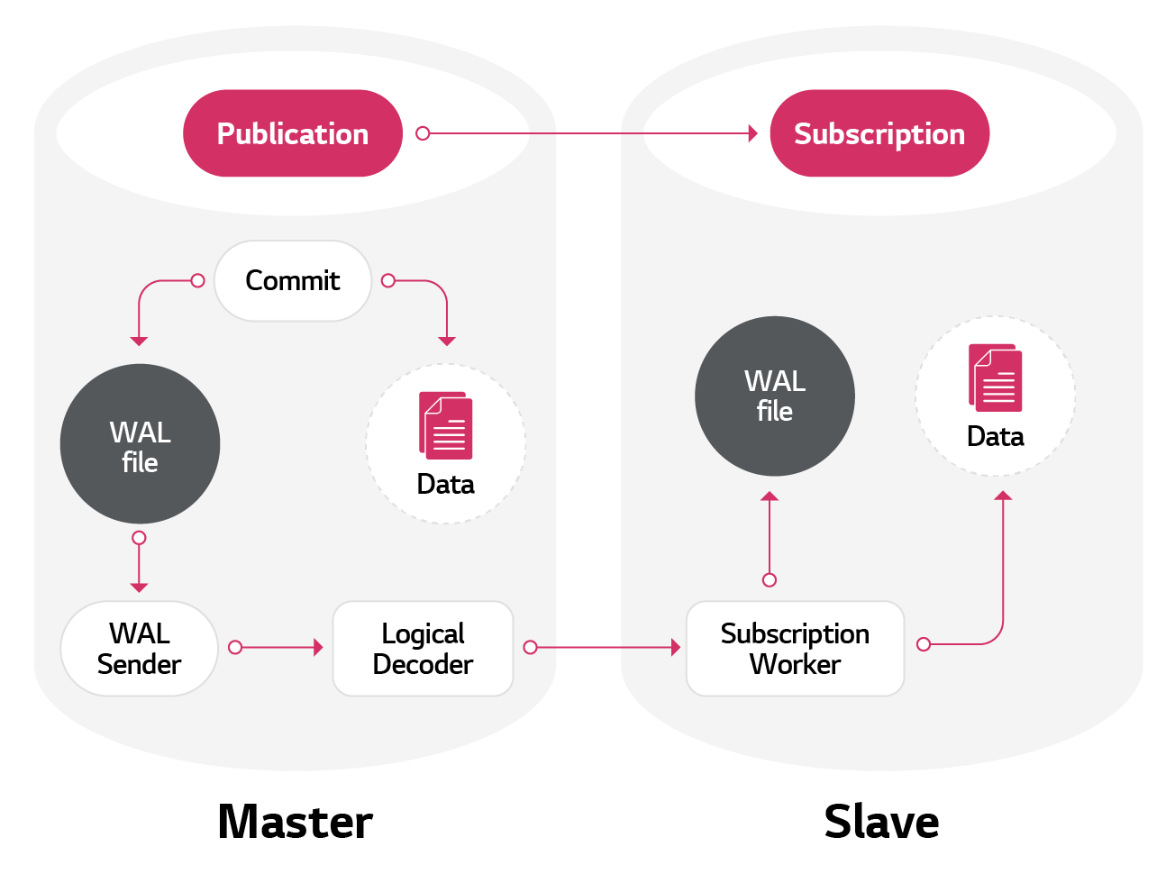 WAL Record의 전송은 Publish & Subscribe 패턴을 따르고 Blue Cluster에서 발생한 변경 사항들은 WAL 파일에 기록됩니다. 변경 사항들은 WAL Record로 분류돼 저장되고 WAL Record가 생성되면, Logical Decoder를 거쳐 Subscriber인 Green Cluster로 전달됩니다.