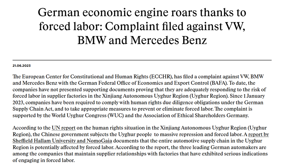 출처: ECCHR(European Center for Constitutional and Human Rights), 독일 자동차 제조사를 강제노동혐의로 고발한 비영리단체