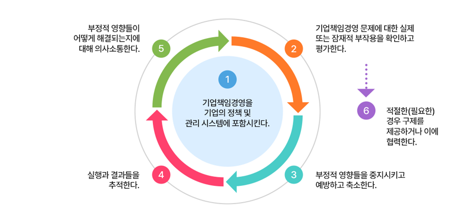 뿐만 아니라, 2018년에는 실사(Due-Diligence) 지침을 별도로 만들어 실사 프로세스의 방향성을 제시했는데요. 실사 프로세스는 ‘비즈니스 행동규범의 내재화’, ‘부정적 영향의 파악과 평가’, ‘부정적 영향의 중지와 예방 및 완화’, ‘조치 결과 모니터링’, ‘대응 현황의 소통’ 5단계로 구성되어 있으며, 이는 이해관계자와의 협력을 요구합니다. 이를 통해, Due Diligence(실사)는 기준 대비 부적합(Non-conformance)을 파악하는 심사보다 개선과 소통, 그리고 협력을 포함한 확장된 개념이라는 것을 알 수 있습니다