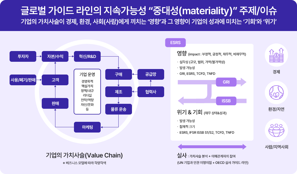 EU ESRS (European Sustainability Reporting Standards): EU ESRS는 GRI의 영향 관점과 SASB의 위기 및 기회 관점을 모두 포용한 기준입니다. 이러한 ESRS의 방식을 이중 중대성(Double Materiality) 관점이고 부릅니다. EU는 2025년부터 일정 규모 이상의 기업들을 대상으로 ESRS 기준에 따라 매년 발간되는 사업보고서에 지속가능성 정보를 포함하여 공개하도록 의무화했습니다.