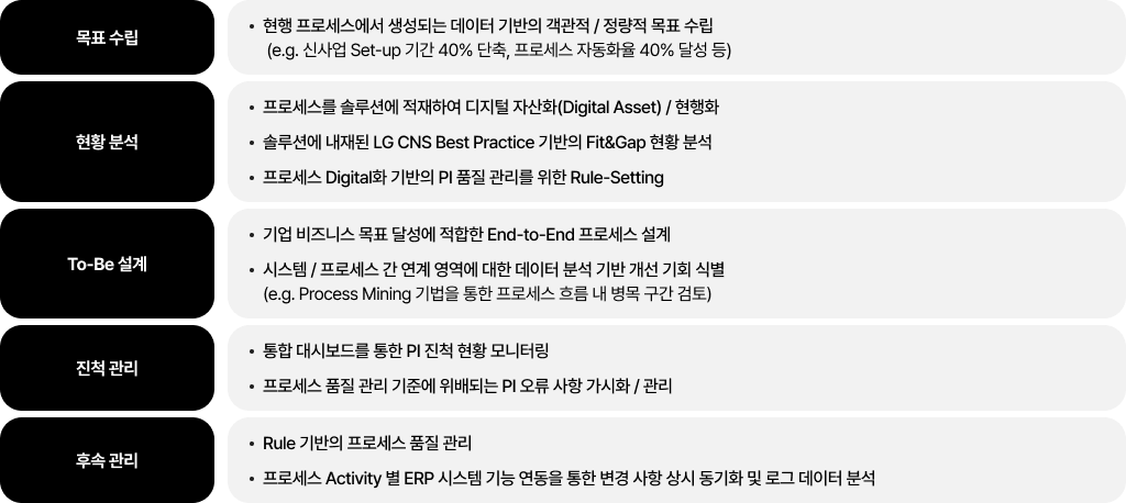 디지털 PI(Digital PI)는 프로세스 관리 솔루션을 통해 PI 목표 수립부터 현황 분석, 과제 도출, 개설 결과 반영까지 데이터 기반으로 지원하는 ERP PI 수행 방법론입니다. 이와 더불어 솔루션 안에 LG CNS의 ERP 프로젝트 수행 성공 사례들을 축적하고 있어, 고객 비즈니스와 유사한 선진 사례들을 참고하여 명확한 프로세스 개선 방향과 필요한 과제들을 도출해 낼 수 있습니다.