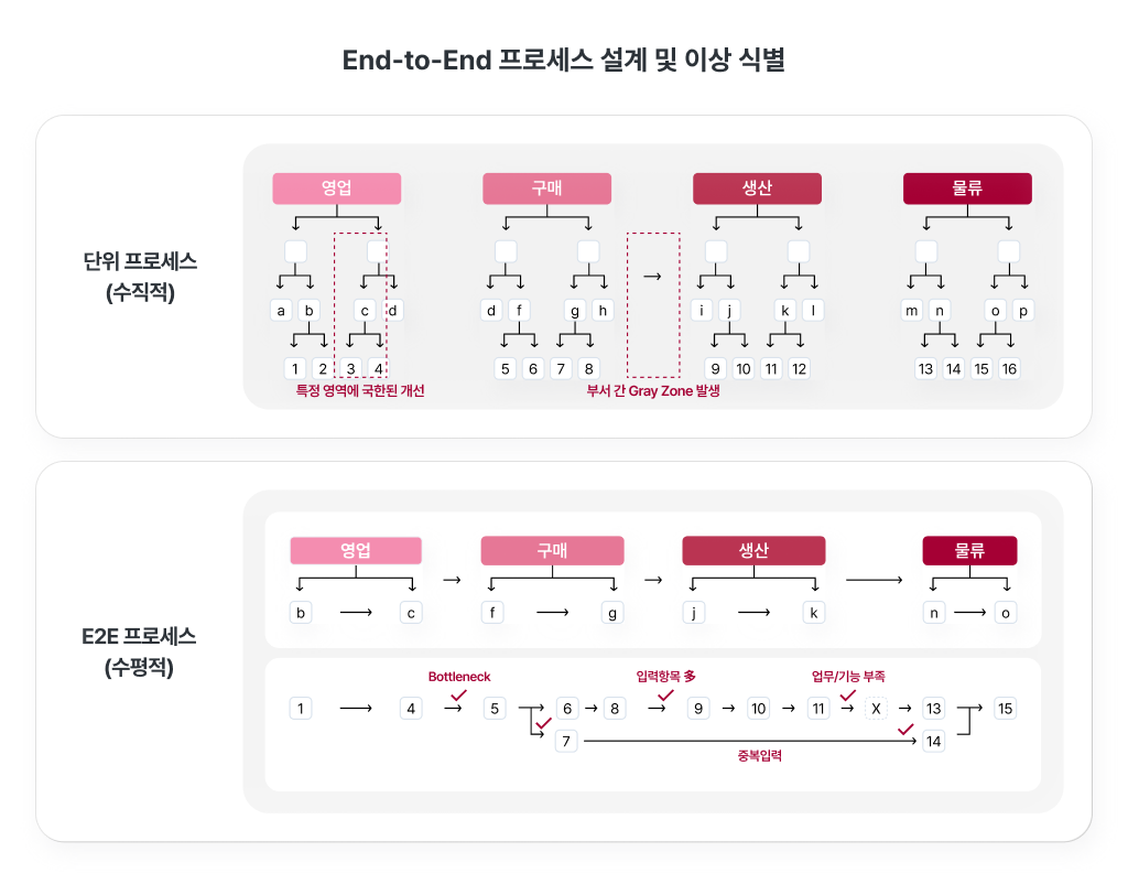 차세대 ERP 전환 프로젝트 수행 시 디지털 PI(Digital PI) 방법론을 활용하여 파편화 되어 관리되던 프로세스를 현행화 및 디지털화 하였으며, 데이터를 기반으로 프로세스를 분석하고 관리할 수 있는 체계를 정립하였습니다. 또한 End-to-End 프로세스 설계를 통해 프로세스에서 관리되어야 할 주요 지표에 대한 정량적 분석을 토대로 문제가 발생하는 원인을 식별하여 개선될 수 있도록 하였습니다.