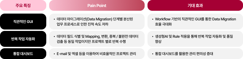 기존의 데이터 마이그레이션 수행 과정은 불필요한 반복 작업이나 수작업으로 인해 작업 효율이 떨어지는 사례가 많았고, 과업 규모는 방대하나 이를 관리할 수 있는 기능이 없어 양질의 데이터 마이그레이션 품질을 확보하는 것이 쉽지 않았습니다.