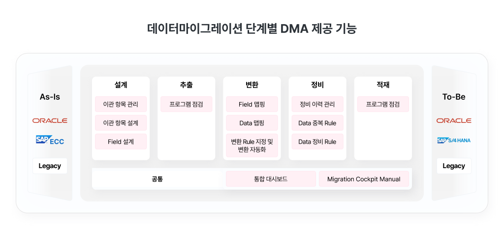 DMA는 이러한 문제를 해결하고자 그동안의 데이터 마이그레이션 수행 경험을 자산화하여 개발된 데이터 마이그레이션 자동화 솔루션입니다. 생성형 AI 기반의 데이터 변환이나 정비 시 발생하는 불필요한 반복 작업이나 수작업에 대한 자동화를 통해 업무 효율성과 정확도를 향상하며, 통합 대시보드를 통해 데이터 마이그레이션 전체 과정에 대한 체계적인 진척 관리를 수행할 수 있습니다.