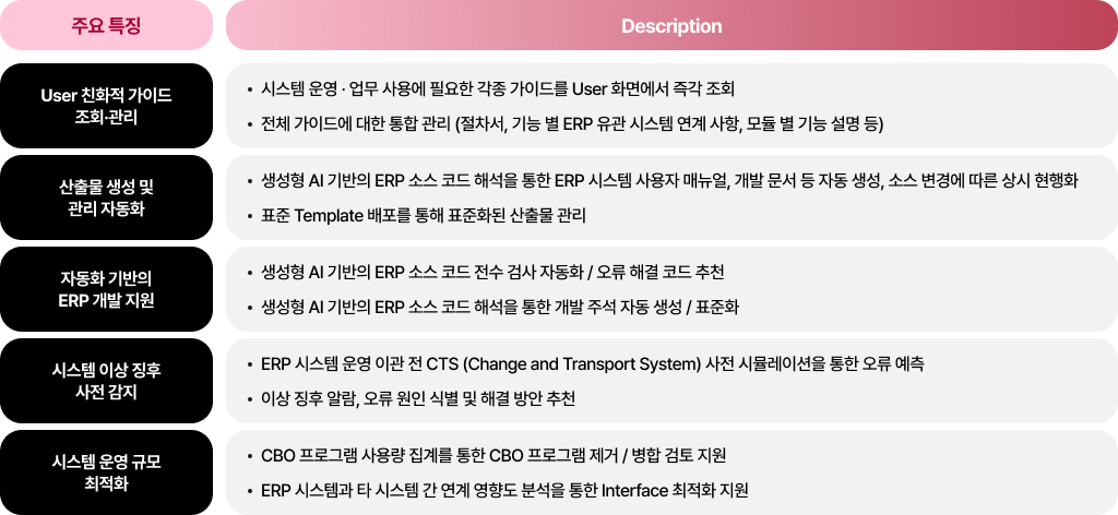 LG CNS 에서는 확보한 ERP Asset을 통해 고객 가치 실현을 위한 지속적인 노력을 기울이고 있습니다. 최근에는 AI를 ERP 시스템에 접목한 Use Case 확보에도 초점을 맞추고 자산화를 활발히 진행하고 있으며, 성공적인 AX on ERP 구현을 지원하고 고객의 비즈니스와 전체 업무 Value Chain 의 혁신을 지원할 수 있는 기반을 다져가고 있습니다.