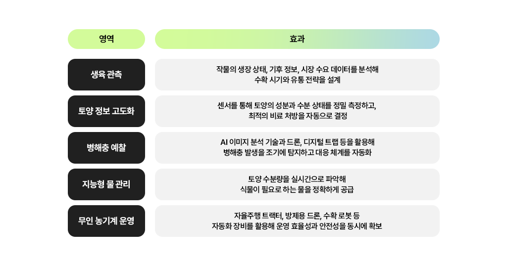 스마트팜이 농업·통신·에너지 등 다양한 산업과 연결되고 새로운 비즈니스로 확장될 수 있었던 배경에는, AI를 비롯한 신기술의 접목으로 고도화된 농업 기술의 발전이 자리하고 있습니다.