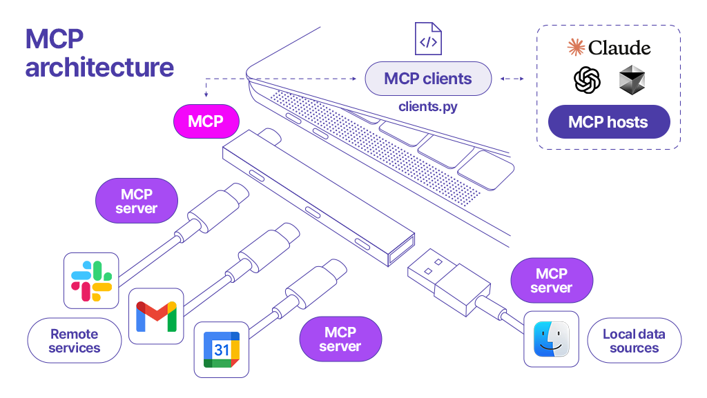 또한 MCP는 별도 코딩 없이도 AI가 외부 데이터 소스나 도구 등과 안전하고 효율적으로 연결될 수 있습니다. 즉 USB-C가 스마트폰, 노트북, 이어폰 등 서로 다른 장치를 하나의 포트로 연결해 주는 것처럼, MCP도 서로 다른 기업에서 개발한 다양한 AI 모델과 데이터 소스, 외부 도구를 통합해 연결할 수 있도록 지원합니다.