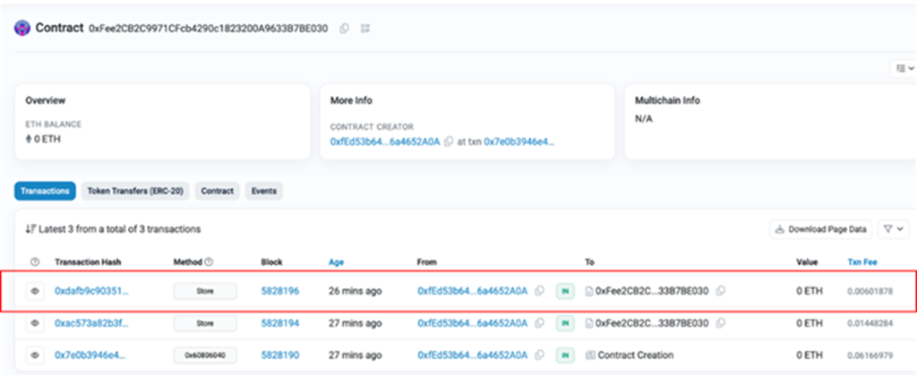 이처럼 세 단계 과정을 거쳐 스마트 컨트랙트를 테스트넷에 배포하면, 해당 컨트랙트는 블록체인 내의 특정 블록에 기록됩니다. 이때 생성된 블록의 번호는 배포 결과를 통해 확인할 수 있습니다.