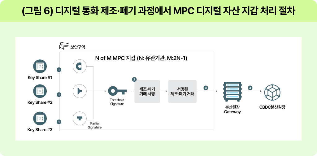 (그림 6)은 MPC 기술을 적용한 지갑 시스템의 구성과 처리 절차를 단계별로 보여줍니다. 먼저, 각 서명 참여자는 분할키를 보안 USB 등 콜드월렛 형태로 금고와 같은 물리적 보안 구역에 보관하며, 서명이 필요한 경우 제조·폐기 작업을 위한 반·출입 절차를 거쳐 보안구역에 입장합니다(①). 이후 보안구역 내 오프라인 상태의 MPC 지갑 응용시스템에 분할키를 삽입해 부분서명을 생성합니다. MPC 지갑 응용시스템은 설정된 임계치(N of M)를 충족하는 부분서명이 수집되면, 제조·폐기를 위한 트랜잭션 메시지에 서명을 적용합니다(②). 서명이 완료된 트랜잭션은 외부로 안전하게 반출되며(③), 블록체인 게이트웨이(Gateway)를 통해 분산원장에 제출되어 최종적으로 거래가 실행됩니다(④).