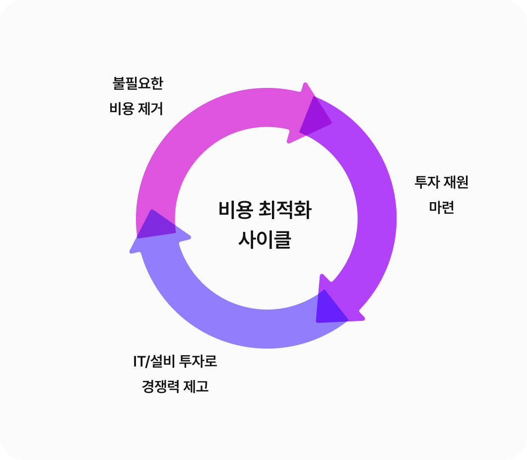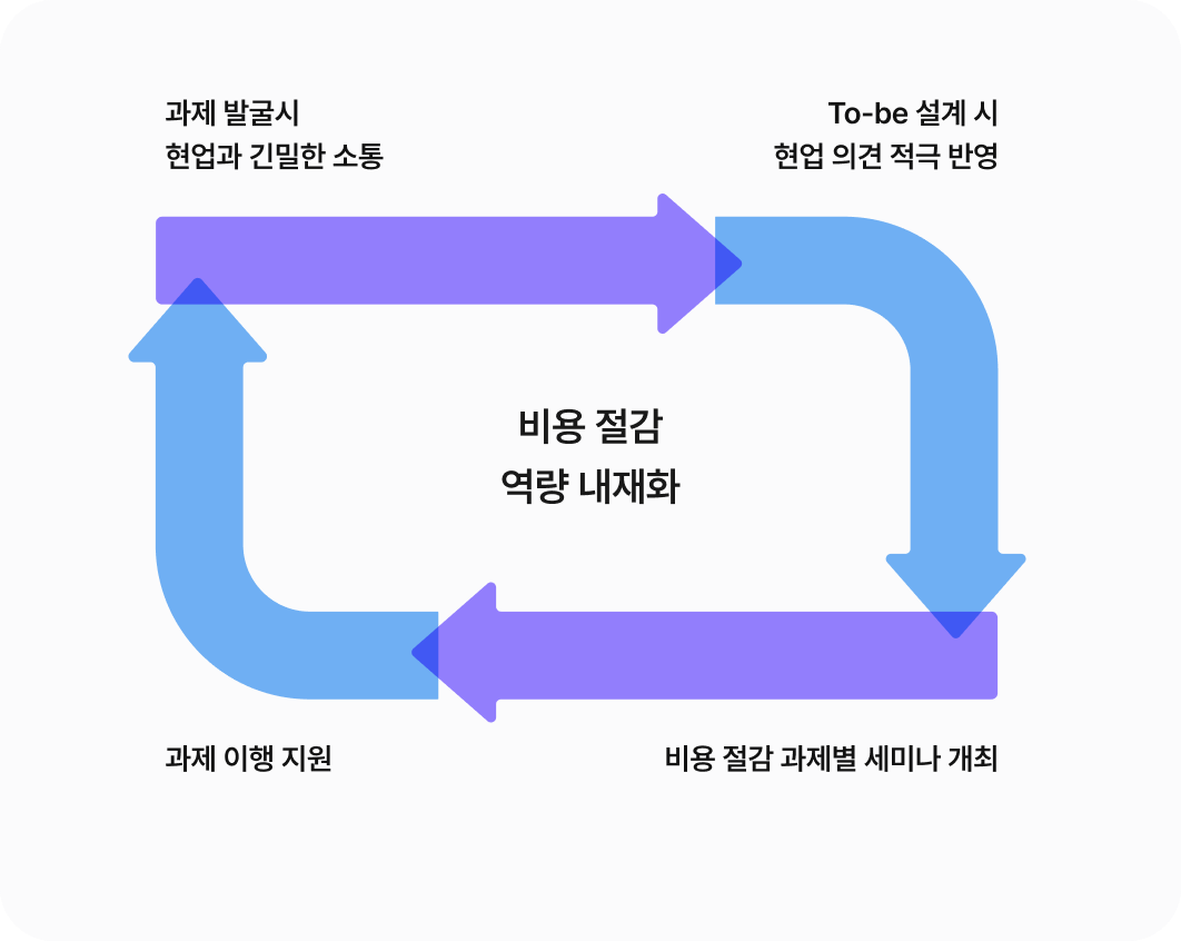 운영 프로세스의 비효율과 불필요한 지출 항목을 제거해 낭비 없는 비용 구조를 구축합니다. 이렇게 확보한 절감 재원은 신규 투자, 디지털 전환, 조직 고도화 등에 전략적으로 활용될 수 있으며, 중장기적으로는 지속적인 비용 최적화 사이클 형성에 이바지합니다.