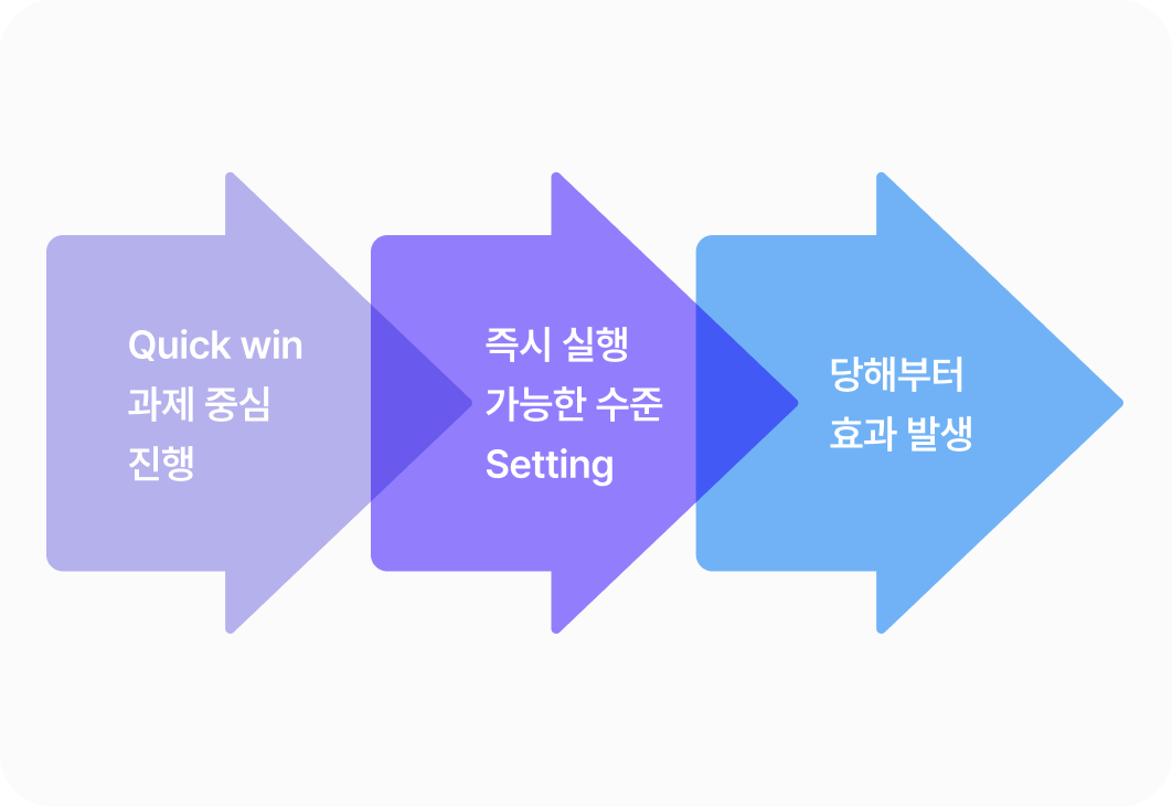 단기 실현 가능성이 높은 ‘Quick-Win’ 과제를 우선 도출하고, 실행 가능 수준까지 구체화하여 즉시 착수할 수 있도록 설계합니다. 특히 비용 구조가 단순하고 개선 난도가 낮은 과제의 경우, 당해 연도부터 절감 효과가 발생할 가능성이 높으며, 이를 통해 이른 시일 내 실행 성과를 체감할 수 있습니다.