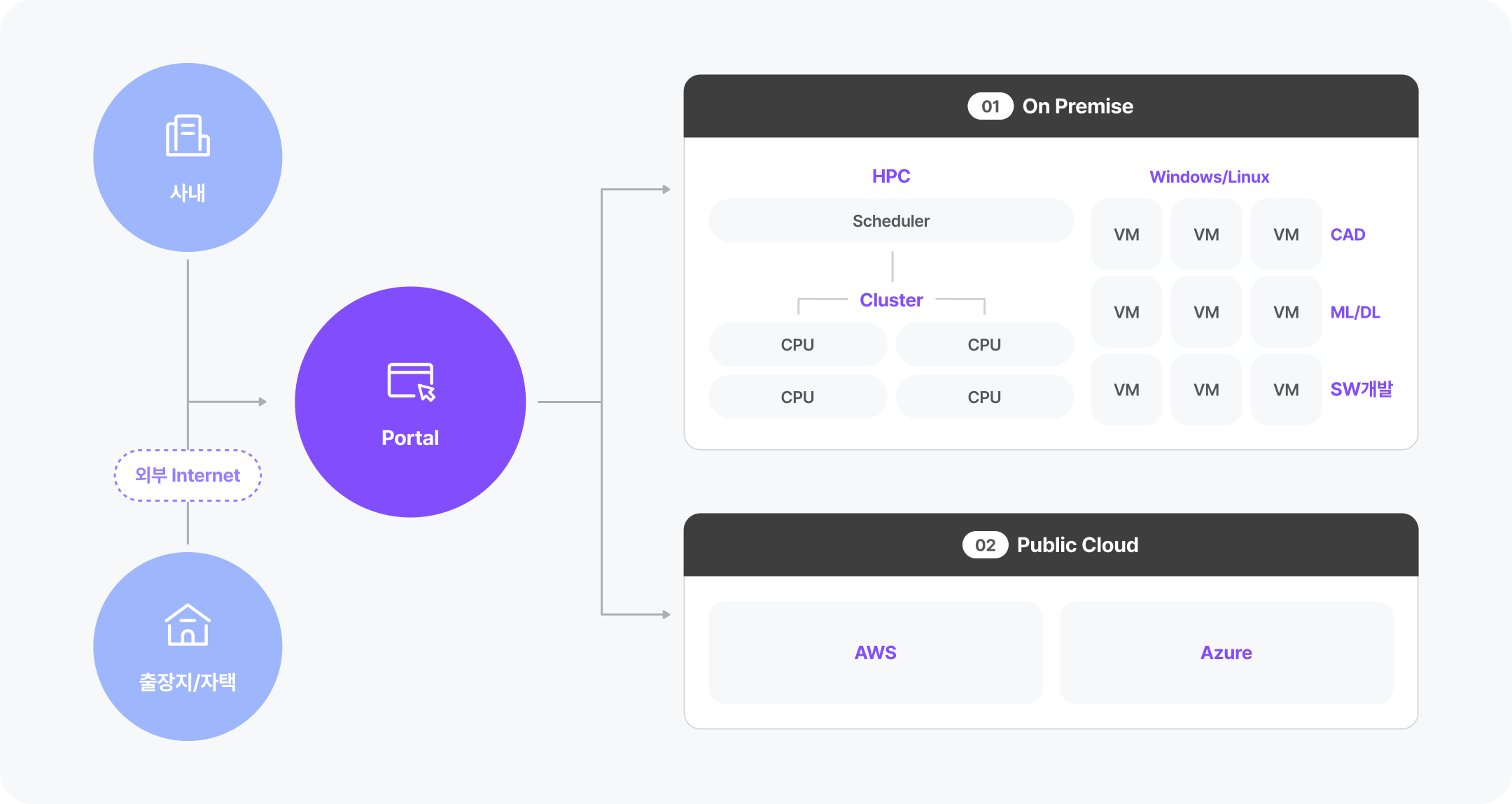 C4 클라우드의 주요 기능은 CAD, 해석 전처리, 후처리 작업을 위한 GPU VDI 자원 제공, 해석 연산을 위한 고성능 CPU 자원 제공, ML/DL을 위한 데이터 분석 자원 제공, SW 및 모델 개발을 위한 개발 및 검증 환경 제공 등 제품 개발 전 과정에서 필요로 하는 도구를 편리하게 사용하실 수 있는 자원을 제공하는 인프라 서비스입니다.